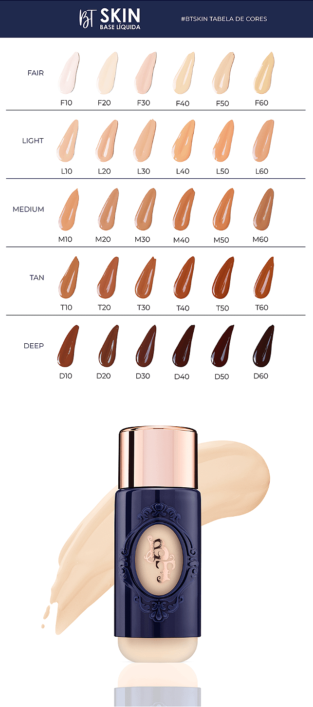 Descubra a base líquida dos seus sonhos com a BT SKIN. Esta fórmula ultrafluida é incrivelmente pigmentada, proporcionando uma textura leve que garante uma aplicação uniforme para um efeito natural. Com acabamento aveludado semi-matte e cobertura de leve a média, você pode construir camadas conforme desejar.